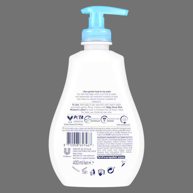 The Baby Dove Rich Moisture Head to Toe Wash is specially formulated for your baby’s delicate skin. This gentle, hypoallergenic wash offers mild cleansing from head to toe, leaving your baby’s skin soft, moisturized, and free from irritation. Its tear-free formula helps maintain the skin’s natural moisture balance, making it perfect for daily use.