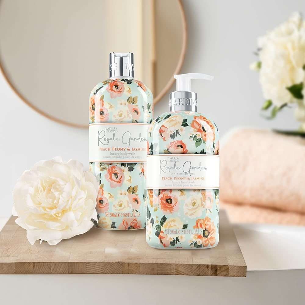 Experience a touch of elegance with the Baylis & Harding Royale Garden Luxury Peach Peony & Jasmine Body Wash (500ml). This indulgent body wash combines the sweet, fruity notes of peach with the delicate floral aromas of peony and jasmine. Ideal for daily use, it gently cleanses your skin while leaving it soft, smooth, and beautifully fragranced. Perfect for a luxurious bath or shower, this body wash adds a sense of pampering to your skincare routine.