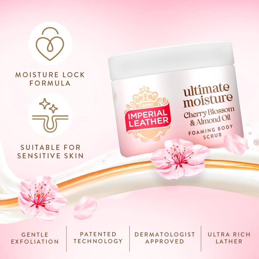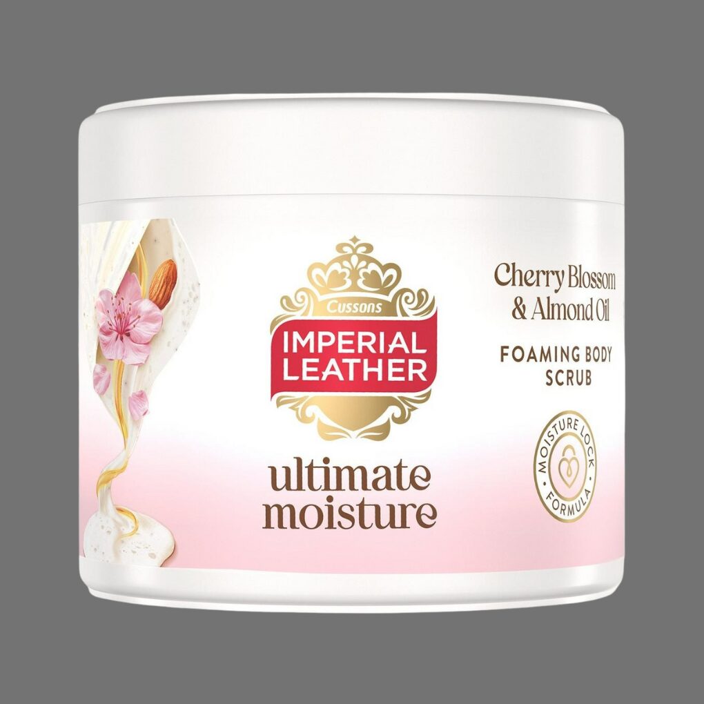 Reveal soft, glowing skin with Imperial Leather Cherry Blossom & Almond Milk Ultimate Moisture Body Scrub 225ml. This creamy exfoliating scrub gently buffs away dry, dull skin using fine exfoliating particles while delivering deep hydration for a smooth, refreshed finish. Infused with the delicate scent of cherry blossom and the silky richness of almond milk, it leaves skin feeling nourished, polished, and beautifully scented — perfect for pairing with your matching Foamburst or Body Wash.