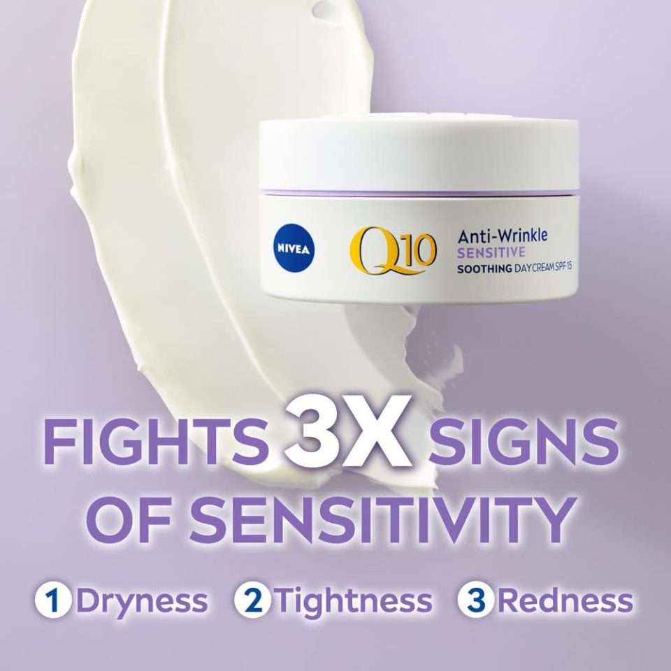 NIVEA Q10 Anti-Wrinkle Sensitive Day Cream 50ml, Specially designed for sensitive skin, this lightweight daily cream supports your skin’s natural moisture balance. Enriched with Coenzyme Q10 and Vitamin E, it helps maintain a hydrated and refreshed appearance. The gentle formula absorbs quickly without leaving a greasy residue, making it ideal for daily use.